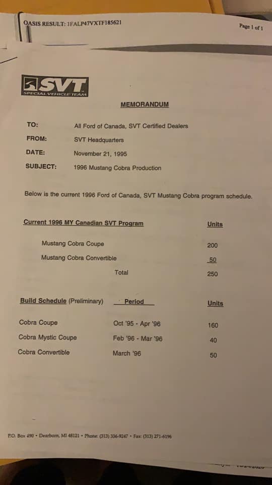 We have found internal Ford Documents that show Ford planned to export 40 (Not sure what the final export number was) 1996 Mystic Cobras to Canada we believe only 1 of these was a cloth non 460 car