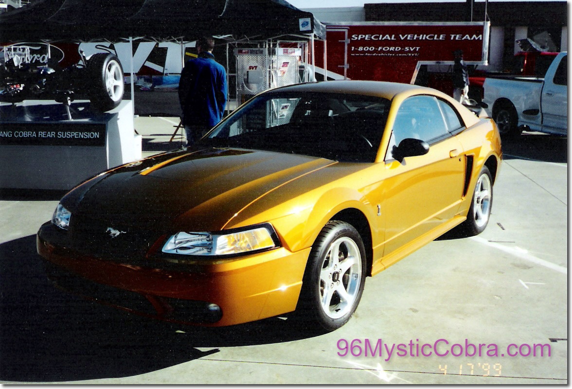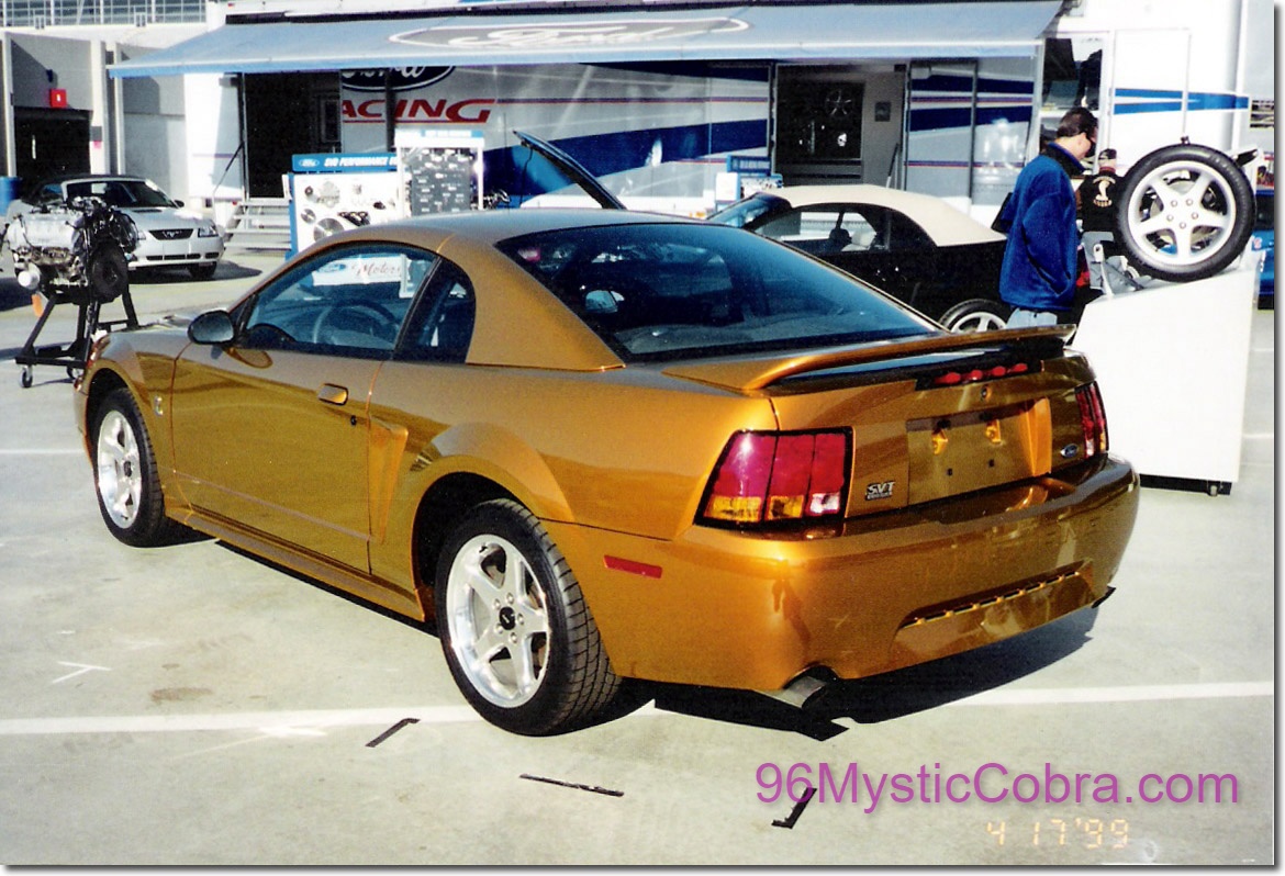 - 5. Following 2 taken at the 1999 Charlotte 40th Anniversary Show. They were taken by Rich Plescia, and he describes the color like so: “The color shift was very, very, subtle. It was sort of a yellow gold to orange gold. Not nearly as obvious as the ’96 or ’04 models”. Note the MUSTANG on the rear bumper. The 2000 Brochure shows the final version 2000 Cobras would have had COBRA on the rear bumper, indicating that this was a 1999 Cobra that the paint had been applied to.