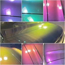 The Mystic line of paints contain color-shifting interference pigments, called ChromaFlair® pigments. These pigments were developed and are manufactured by Flex Products, Inc. They allow the paint to show drastic color changes as observer’s angle to the car, or the angle of the light hitting the car, changes. The microscopic layers act like a tiny prism: White light is reflected off the core layer, and then split by outer layers into visible colors. As the viewing angle changes, so does the visible color. The color produced is controlled by precise variances – measured in atoms – in the prismatic layers. In the case of Mystichrome the thinnest ChromaFlair pigment shifts from gold through silver and into light blue; The thickest pigment shifts from silver through green, and into purplish blue. As a finishing touch, aluminum flakes were added to provide a bright, metallic sparkle.